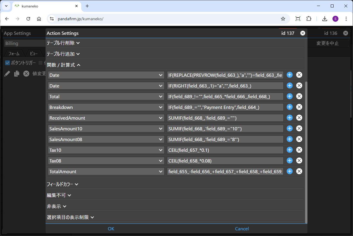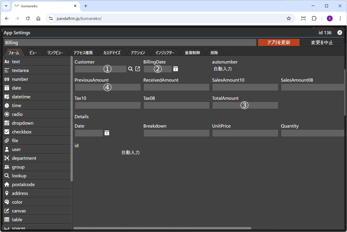 このサンプルアプリでは入金側は内訳への転記が指定されていないので、計算式によって内訳をセットしています。