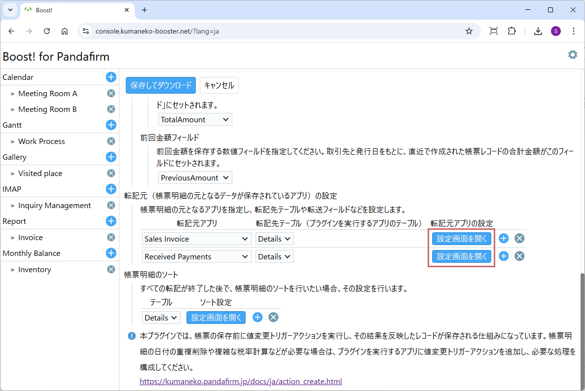 転記元アプリの設定は「設定画面を開く」ボタンをクリックして表示されるポップアップ画面から行います。