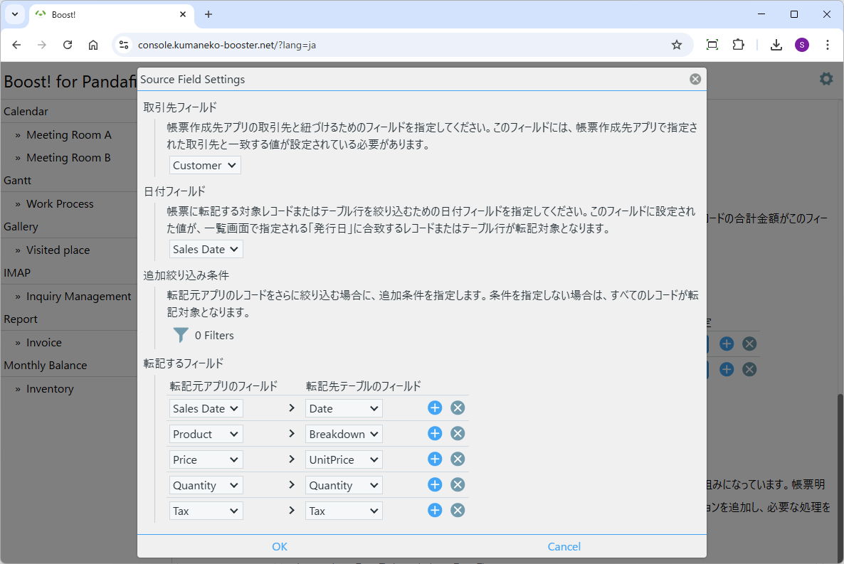 転記元と転記先の対応するフィールドを指定します。