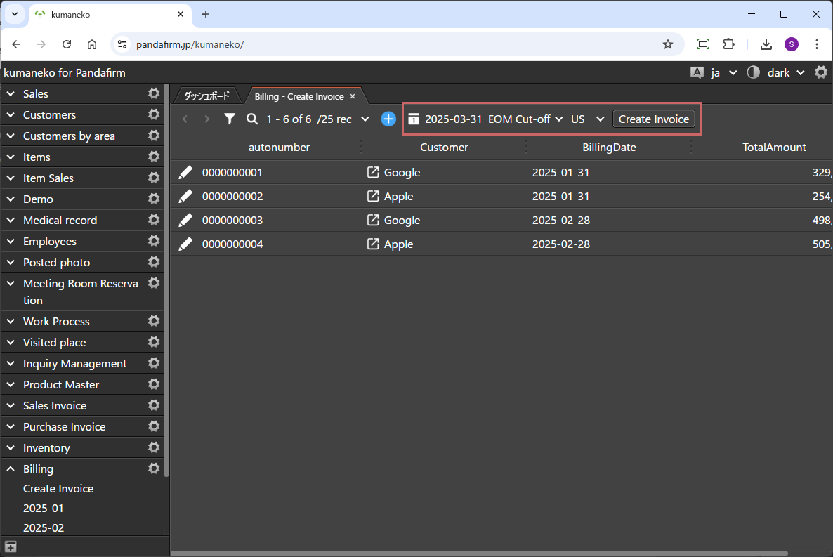 設定画面で指定した一覧形式のビューを表示すると、発生日を選択する為のカレンダーアイコンと、設定済みであれば、帳票作成対象の取引先を絞り込むドロップダウンと、帳票作成を行う実行ボタンが表示されます。